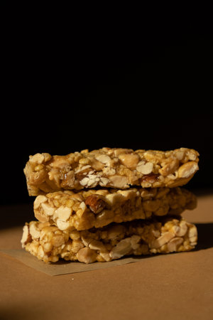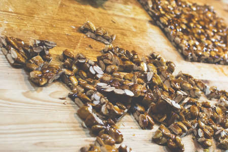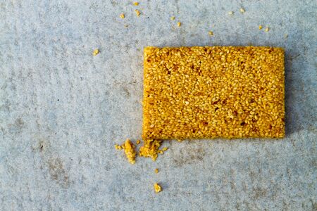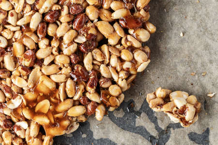 Vegetarian sweets. Granola bars made of sesame seeds, peanuts, cashew nuts, sunflowers seeds, oil and honey.