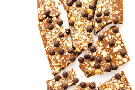 Milk chocolate pieces with whole hazelnuts. Chocolate bar / chocolate background/ nut chocolate / chocolate tower