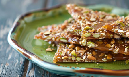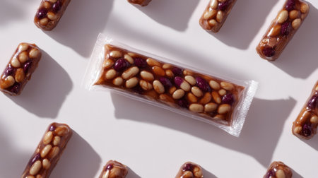 Enjoy a visually appealing display of nutty snack bars featuring pine nuts and dried fruits, perfect for health-conscious consumers and culinary enthusiasts.
