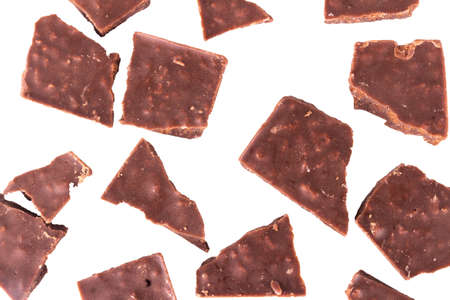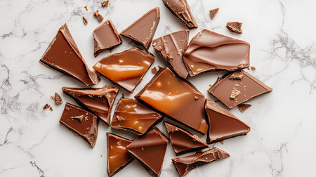 A stunning arrangement of broken dark chocolate pieces with luscious caramel filling sprinkled on a beautiful marble surface, showcasing delicious indulgence.