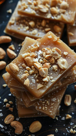 Homemade caramel candy with peanuts on a dark background. toning. selective focus