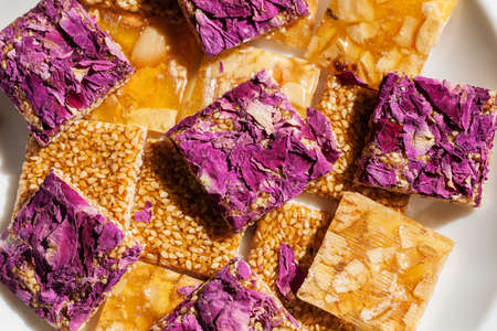 Pile of oriental sweets with nuts, seeds and rose petals in a white plate, top view, selective focus, flat lay