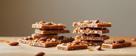 AI Generated. Crunchy almond toffee treats stacked with whole nuts and caramelized sugar on a wooden surface