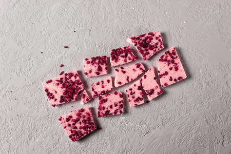 Fashionable pink or ruby chocolate with pieces of berries and fruits. View from above