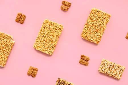Sweet natural fitness bars with nuts and cereals on a gray background. Flat lay. High quality photo.