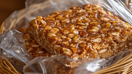 Discover a delightful assortment of peanut caramel treats nestled in a rustic basket, encased in plastic wrap