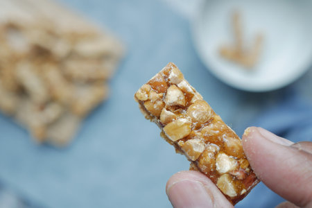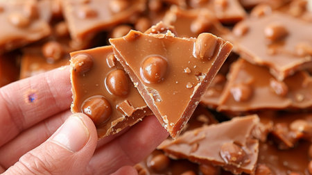 Hand breaking peanut brittle, close up showcasing crunchy texture and peanuts for satisfying bite