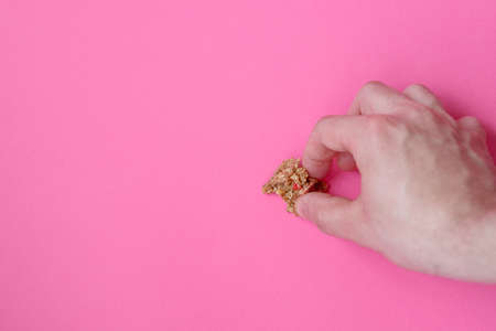 One piece gluten free granola cereal snack, seed, protein energy bar with dried fruit, various nuts, pink background. Healthy vegan super food, fitness dieting snack, sporty lifestyle. hand takes a bar