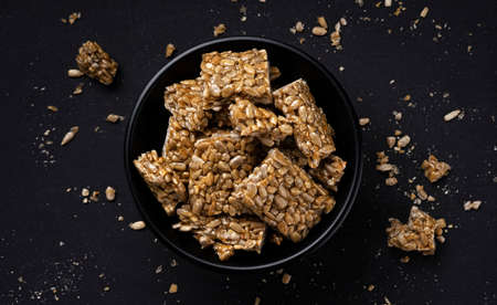 Granola bar. Healthy sweet dessert snack. Sesame, hazelnut, sunflower in honey. Gozinaki is Georgian national food, oriental sweet on black stone background.