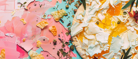 A captivating image of vibrant glass shards floating gracefully against a colorful background, enhanced by sparkling water droplets and soft focus elements.