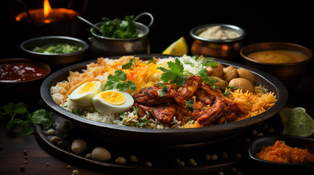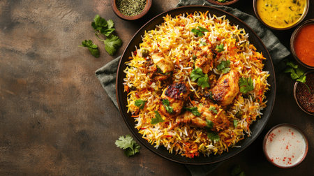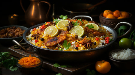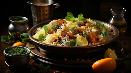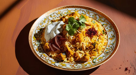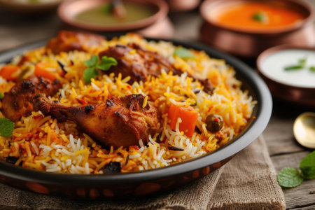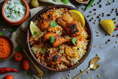 Traditional indian chicken biryani served with saffron and spices