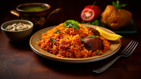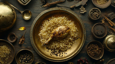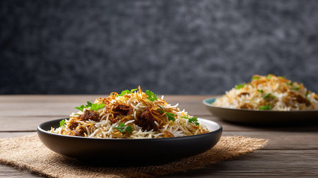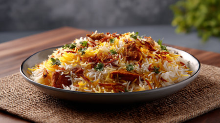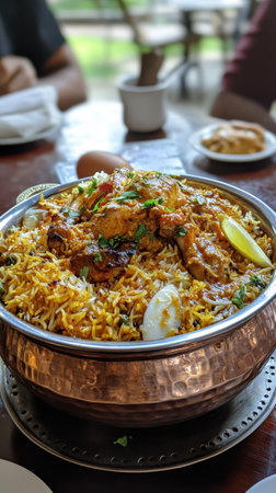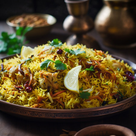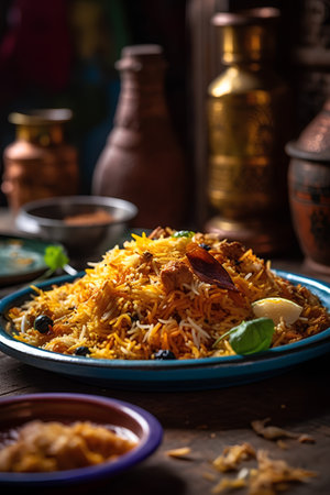 Delicious chicken biryani dish presented on rustic table setting expertly
