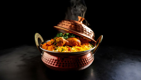 A steaming copper pot with a decorative lid reveals layers of vibrant yellow and orange basmati rice mixed with tender marinated chicken pieces. Fresh green herbs garnish the dish, and wisps of steam rise, indicating the food is freshly cooked. The pot intricate patterns and sturdy handles, set against a dark background.
