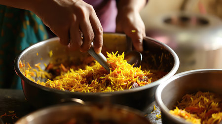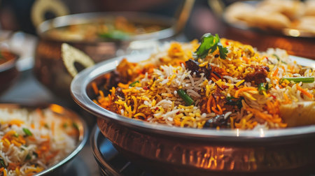 Capture the essence of Indian street food with this close-up shot of Biryani, a fragrant rice dish with meat or vegetables. The dish features basmati rice, layered with tender pieces of chicken or lamb, and an assortment of colorful vegetables and spices, including saffron, cinnamon, cardamom, and cumin. Garnished with fresh mint leaves and served with a side of cooling yogurt raita, this dish is perfect for a lively and festive mood. The bright, natural lighting and vibrant colors of the street food scene add to the lively atmosphere.