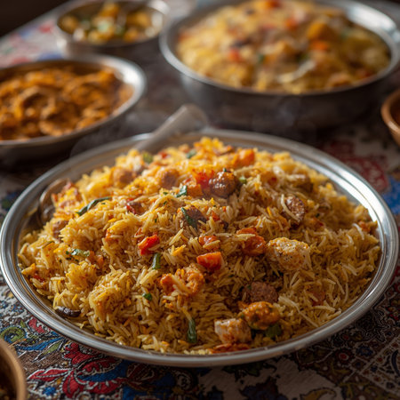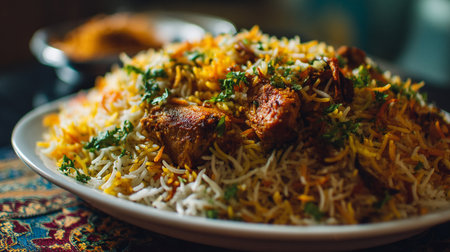 Delicious Chicken Biryani: A Vibrant Indian Dish Served on Decorated Tablecloth