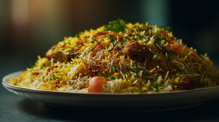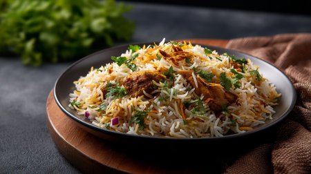 Discover a delicious plate of chicken biryani, vibrant with spices and fresh herbs. Perfect for culinary inspiration and showcasing rich flavors in food photography.