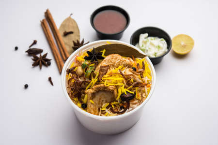 Restaurant style Gosht or Mutton Biryani or Pulao packed for home delivery in plastic box or container with Raita and salan
