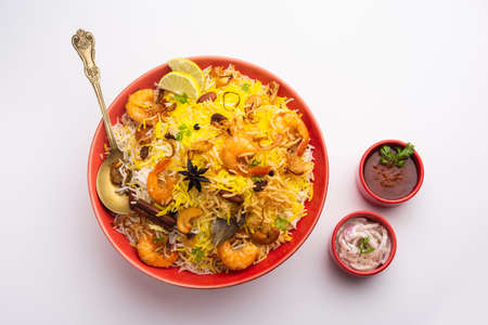 Tasty and delicious prawns biryani, jheenga pulav or shrimp pilaf