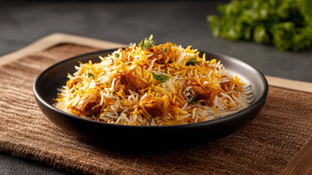 Delicious chicken biryani served in elegant black bowl, ready to eat