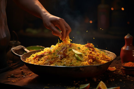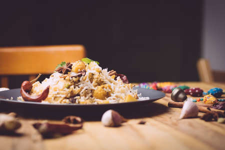 Traditional indian biryani with spices and vegetables, selective focus