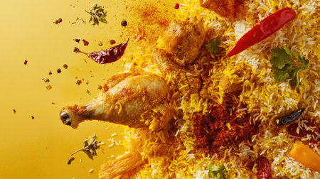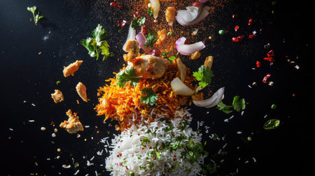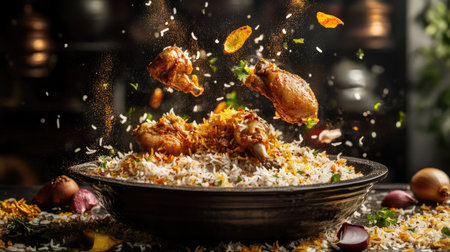 A delicious food explosion featuring flying pieces of spicy chicken biryani with golden rice, aromatic herbs, and fried onions,