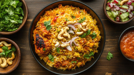 Flat lay of Chicken Biryani with saffron-infused rice and tender chicken, garnished with fried onions and cashews,