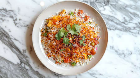 A vibrant plate of biryani featuring fluffy rice layered with aromatic spices, fresh herbs, and colorful vegetables, beautifully presented on a marble surface.