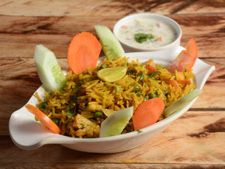 Traditional hyderabadi Vegetable / veg biryani with mixed veggies served with curry, selective focus