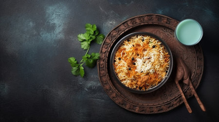 Top view of Indian biryani served with raita, and ample room for copy space.