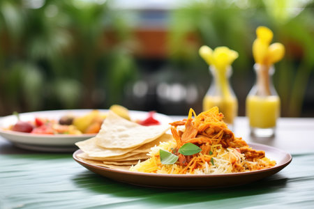 biryani on a banana leaf plate with papadum beside