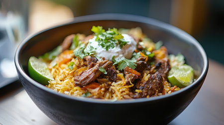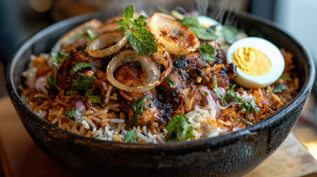 Traditional indian lamb biryani served in a bowl with rice and garnish