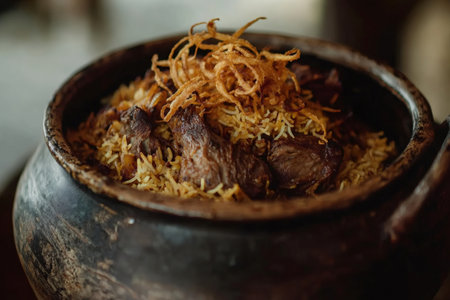 Close up of aromatic lamb biryani garnished with crispy fried onions, served in a traditional rustic clay pot, showing a flavorful Middle Eastern or Indian dish