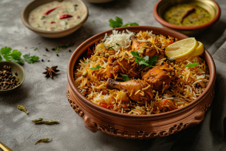 Chicken dhum biriyani using jeera rice and spices arranged in earthen ware with raitha and lemon pickle on grey background Ai generated