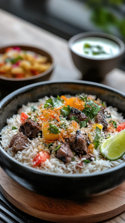Close-up of a vibrant plate of biryani with colorful spices, garnished with fresh herbs and served with a side of raita and salad.