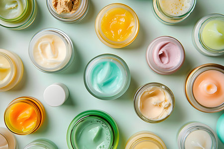 Assorted skincare cream jars, colorful beauty treatment products, cosmetic texture display. Top view. White background. Concept of skin care variety, beauty assortment, organic facial and body creams