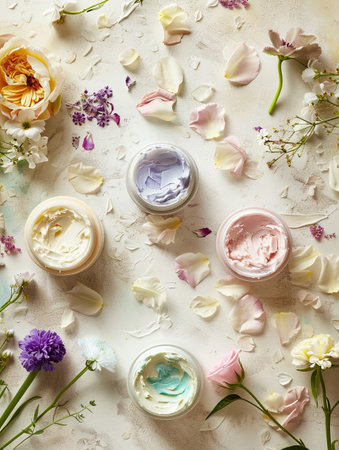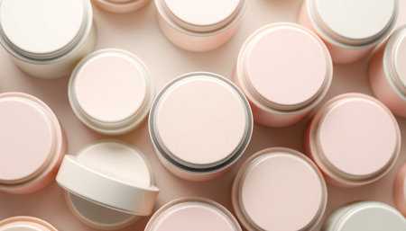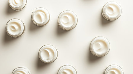 A captivating flat lay image showcasing cream jars arranged neatly on a neutral background, perfect for skincare and cosmetic branding or marketing purposes.