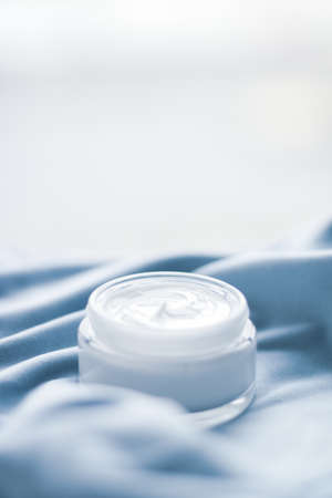 Beauty, anti-age cosmetics and skincare concept - Luxury face cream jar on blue silk