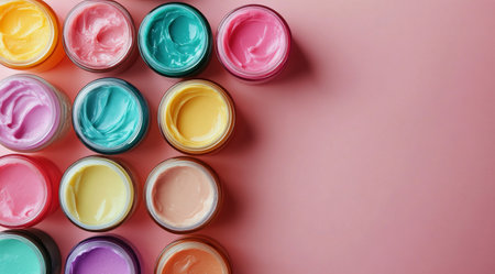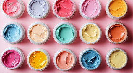 An array of vibrant jars filled with creamy paint sits neatly on a pastel pink surface, showing various colors. This setup is perfect for artists seeking inspiration for their next creative project.
