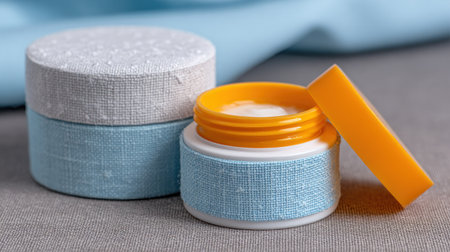 , horizontal photograph featuring three small, cylindrical containers designed for cosmetic products. One open container in the foreground reveals a white cream inside, with its bright orange lid resting beside it. Behind it, two other closed containers are stacked, one with a light blue base texture and a light gray, slightly damp-looking lid, suggesting natural or moisture-related benefits. The containers sit on a neutral gray, textile surface, with a soft blue fabric draped in the background, creating a calm, spa-like setting.