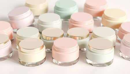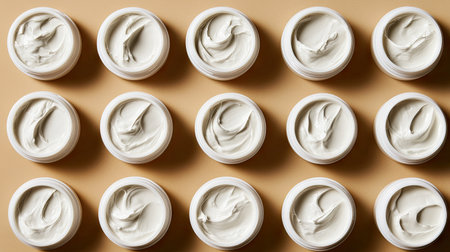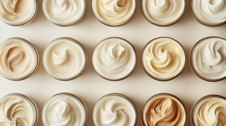This image showcases an organized layout of cream containers featuring smooth textures against a solid background, ideal for beauty and skincare themes.