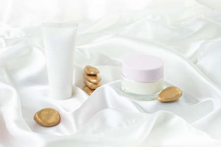 Hand cream tube and glass jar with empty space for label on white satin background. Cosmetic product photography backdrop