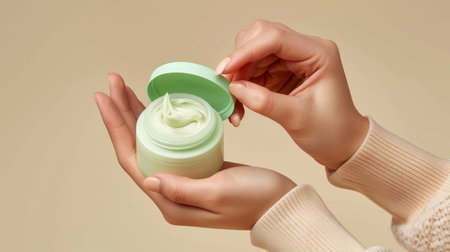 Female hands holding a jar of moisturizer cream on beige background