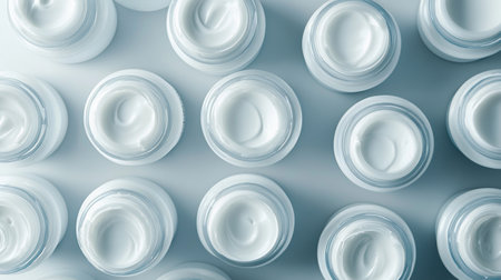 An overhead view of multiple white cream containers arranged symmetrically on a minimalist background. The image conveys a clean, fresh, and modern skincare aesthetic.