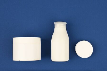 Face cream jar with plastic cap and whire carton box, package on blue background. Mockup unbranded cosmetology product.