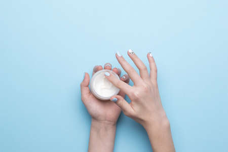 Women's hands take cream from a jar on a blue background. Hand skin care. Flat lay.