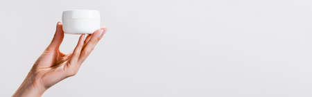 cropped view of woman holding container of hand cream isolated on gray, banner