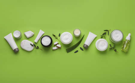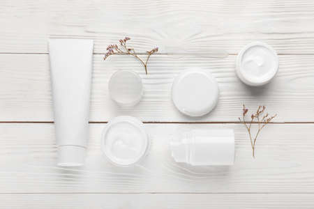 Composition with jars of natural cosmetic cream on light wooden background