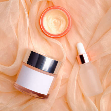 Cosmetics jar with moisturizer cream and body lotion on peach color fabric. Flat lay, top view. Beauty product packaging design.