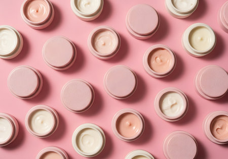 A high-angle shot captures numerous small, round cosmetic jars, some open revealing creamy product, others closed with pink lids, scattered across a vibrant pink backdrop.