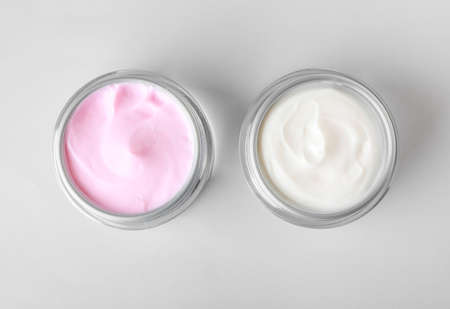 Cosmetic cream in glass jars on light background